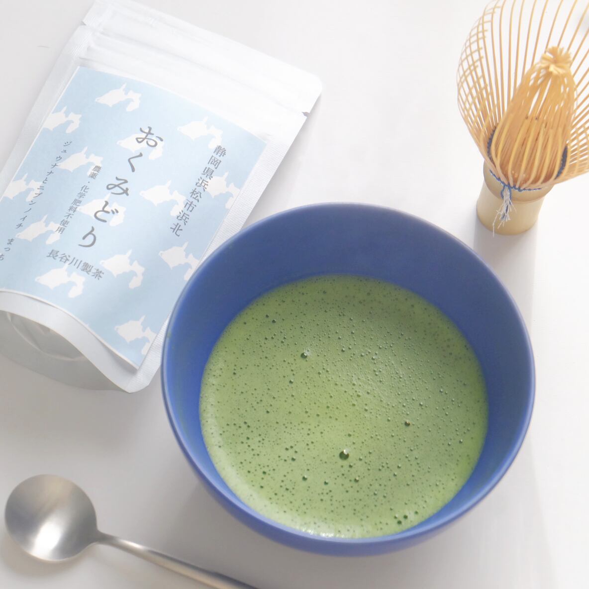 当店で販売している抹茶(8g)、静岡県浜松産おくみどりをセットでお付けします。